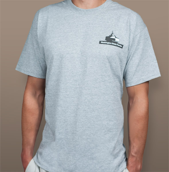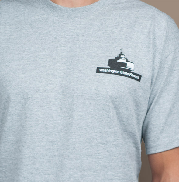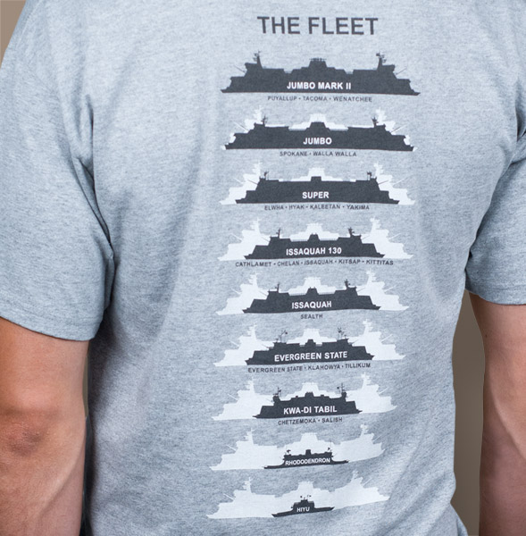 | The Fleet T-Shirt The WSF system is the largest in the United States! This shirt is a tribute to the many hard working boats that ply the waters of the Northwest on a daily basis. Athletic Heather Gray. 90/10 Poly-Cotton Blend. Short Sleeved. Adult S - 3XL.Limited sizes available. We are making room for an updated fleet shirt showing WSF's newest ferries: the Tokitae and Samish. Price: $19.99 USD