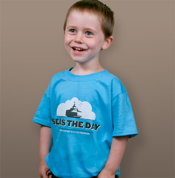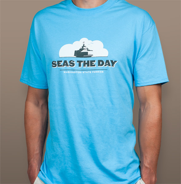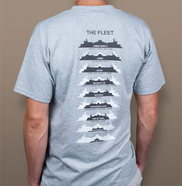 Limited sizes available. We are making room for an updated fleet shirt showing WSF's newest ferries: the Tokitae and Samish.